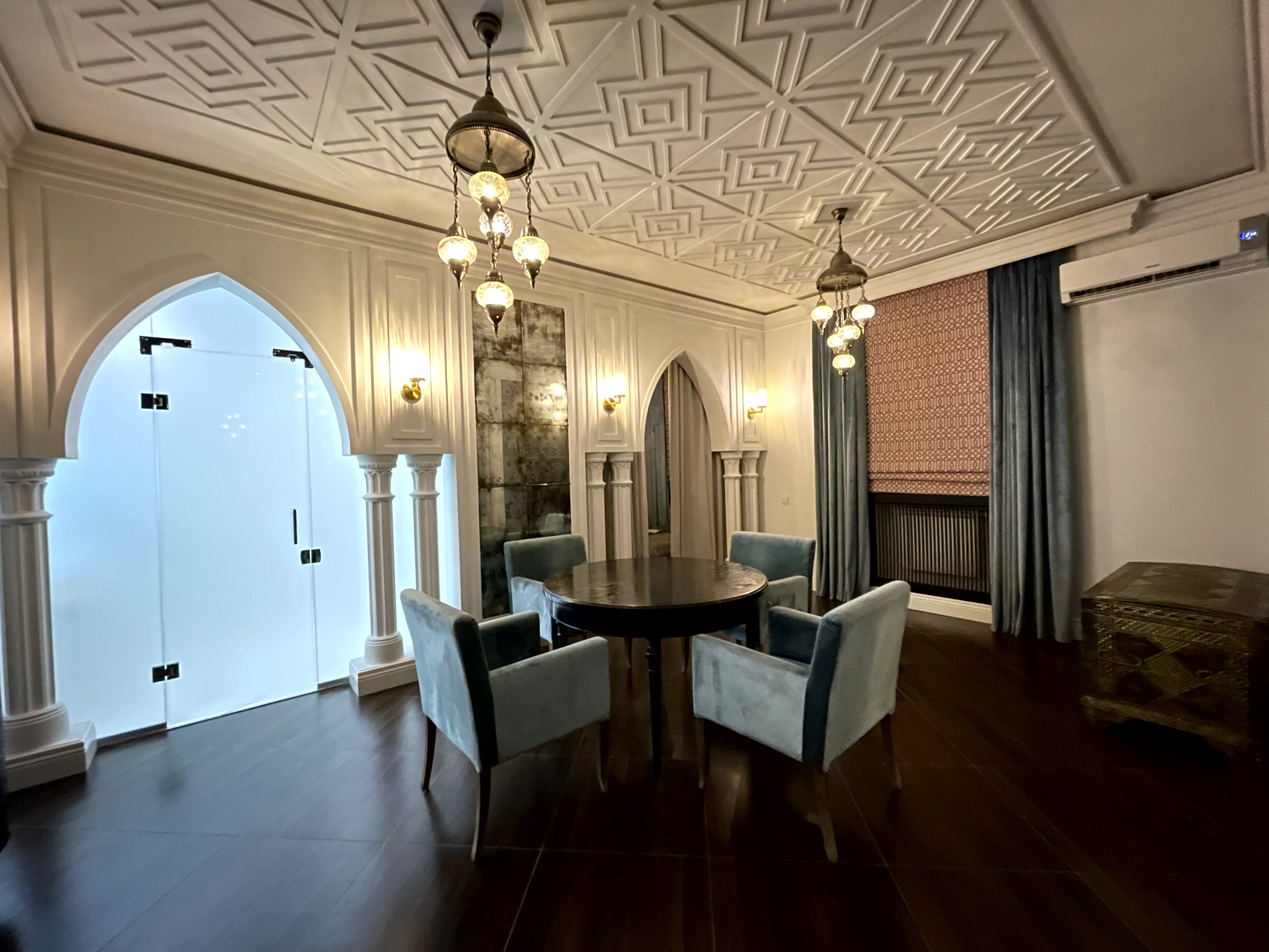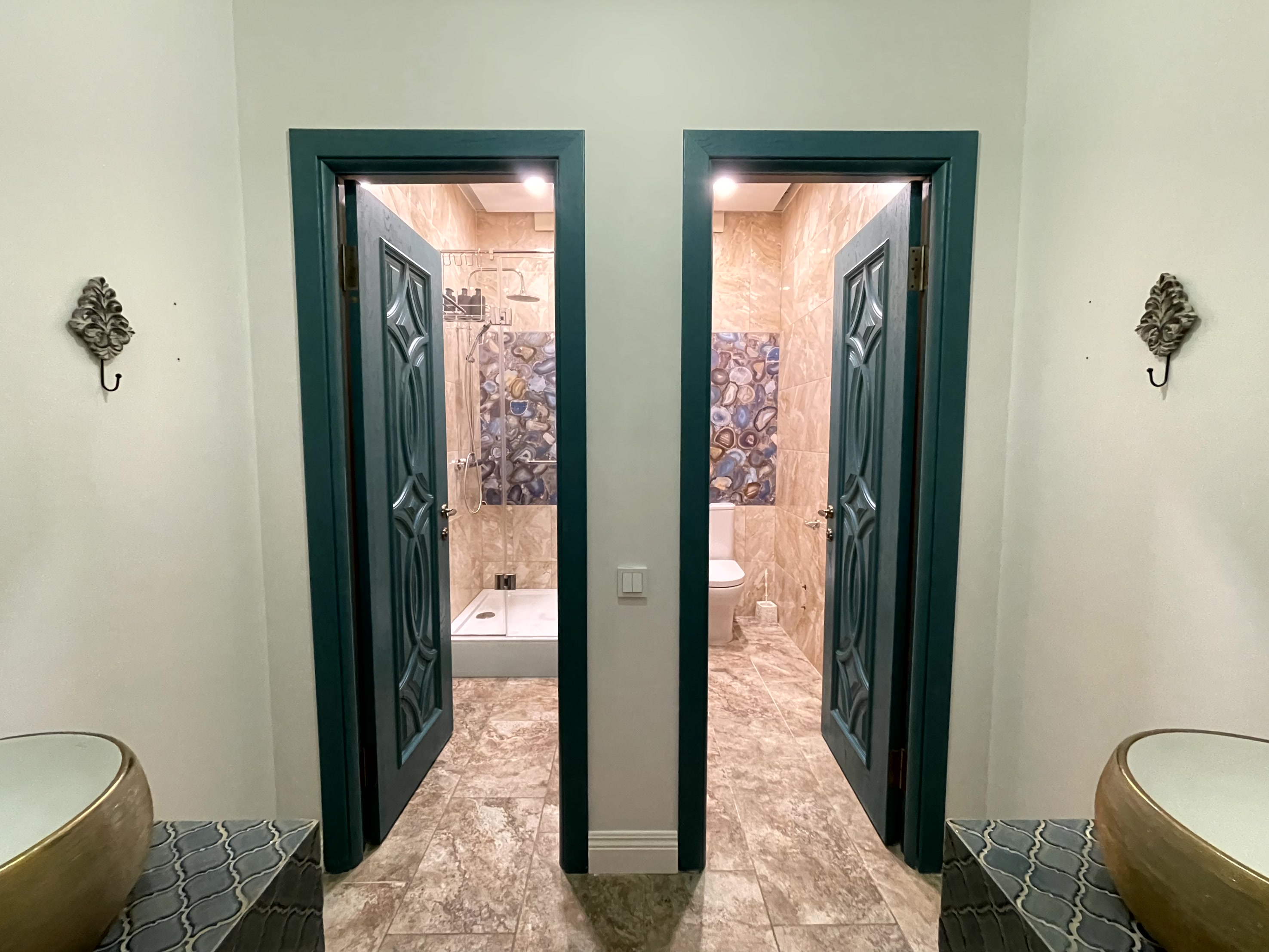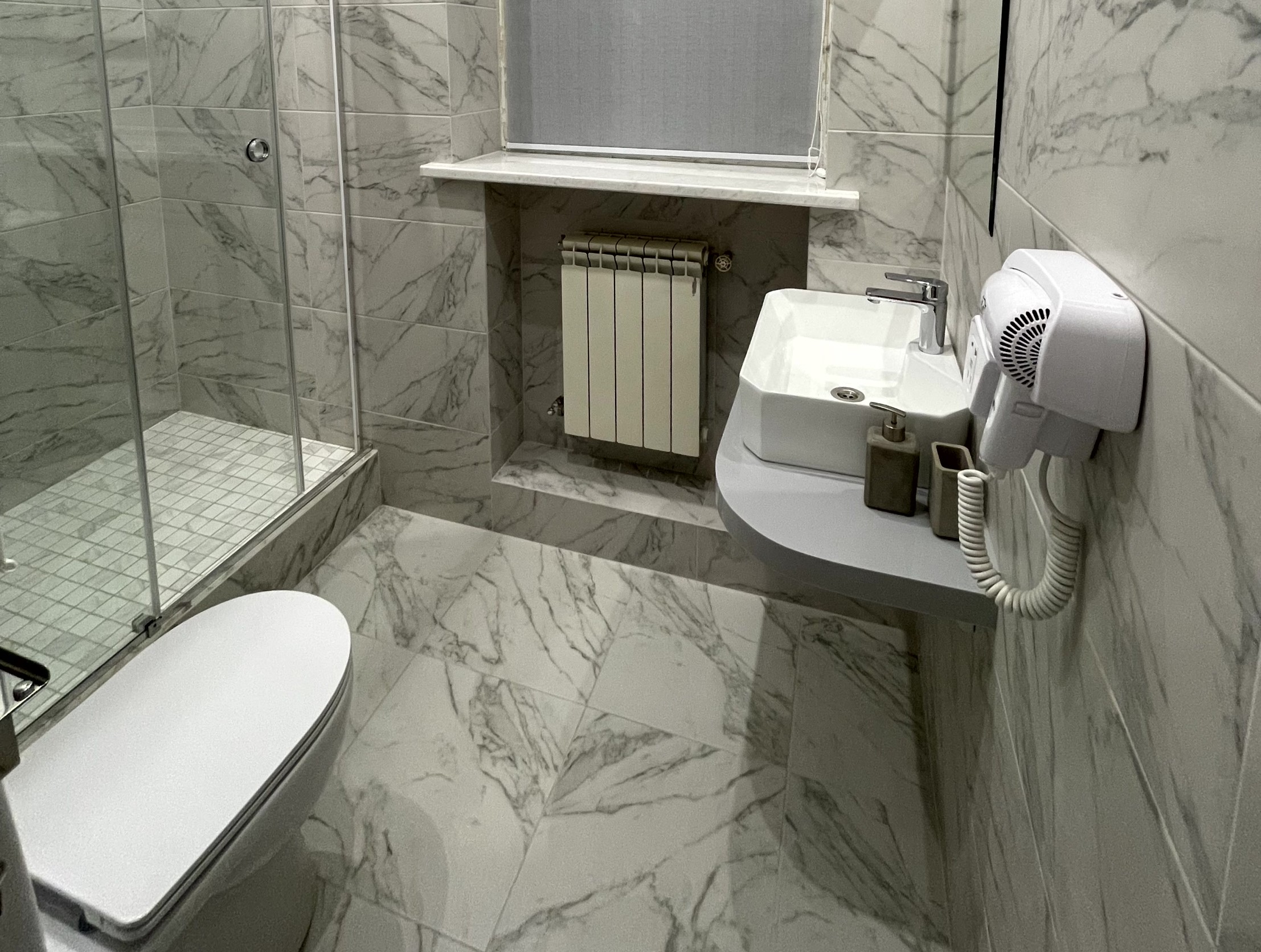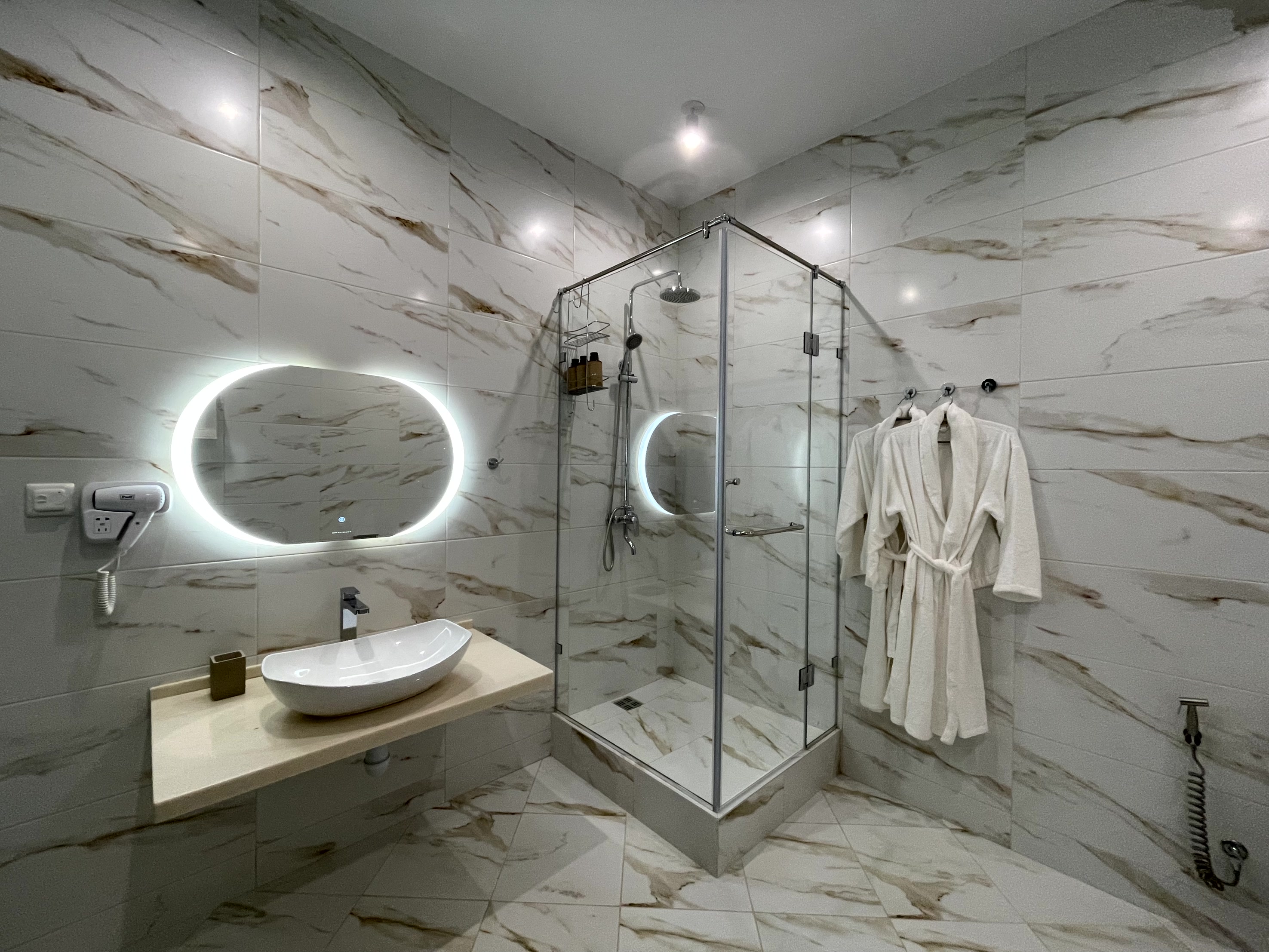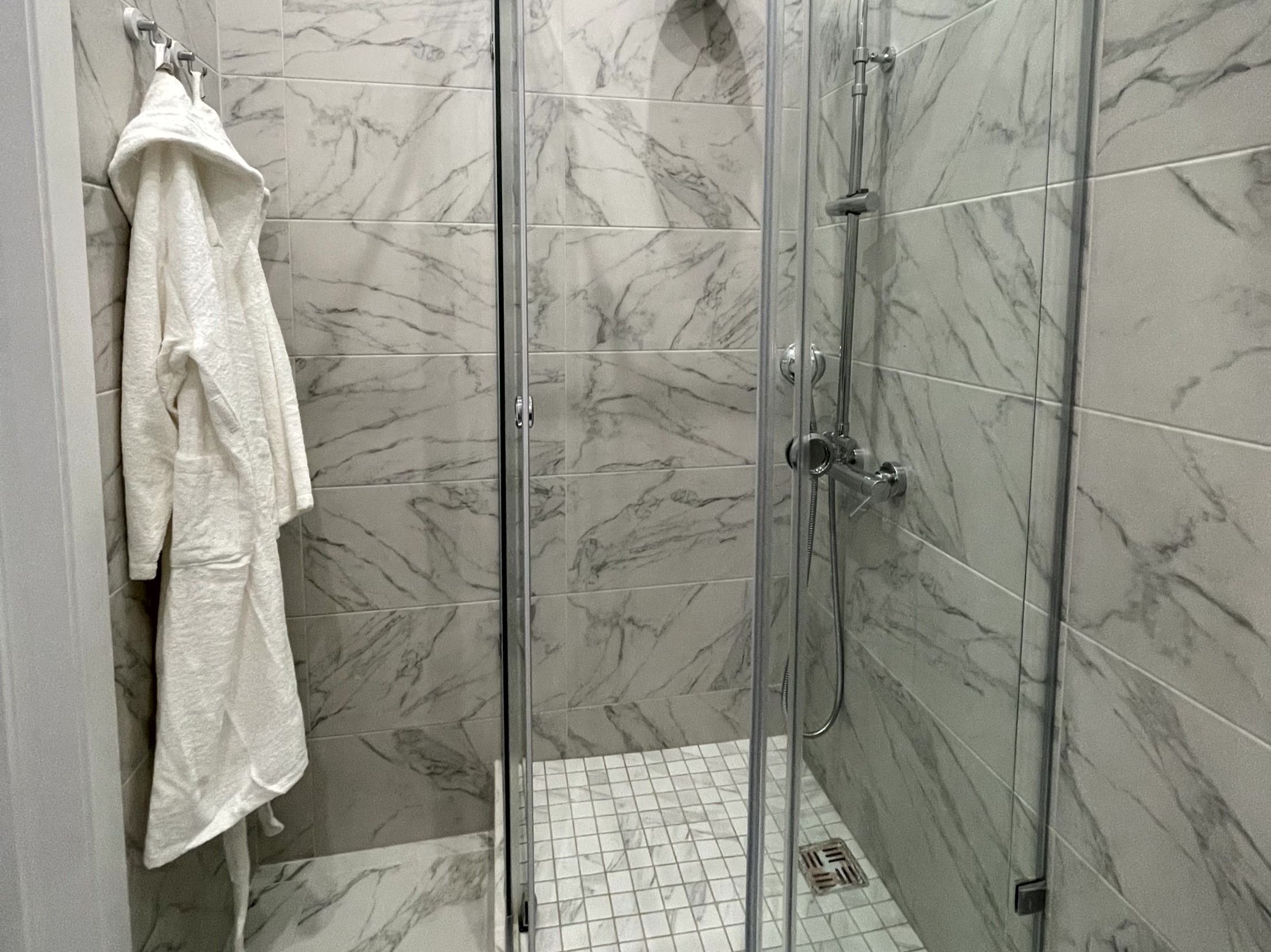 - Санузел: с душевой кабиной, тапочки, туалетные принадлежности, фен, халат